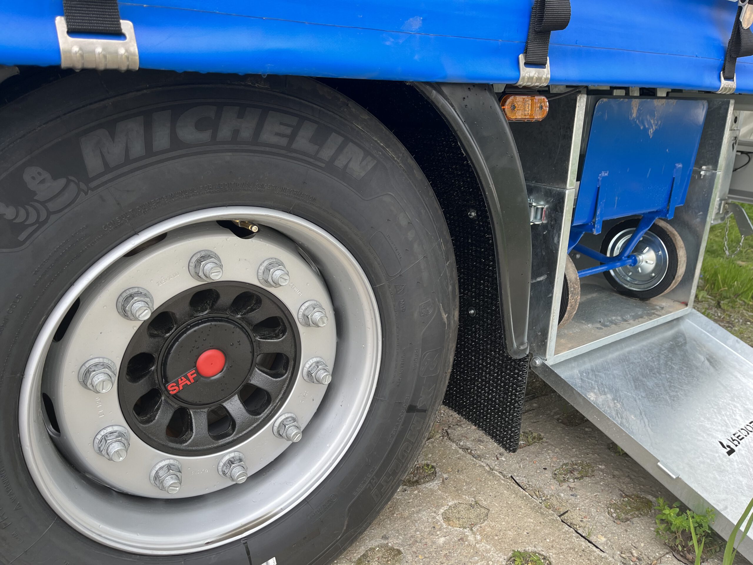 Przyczepa wyposażona jest w osie SAF o udźwigu 9 000 kg, a zawieszenie pneumatyczne KNORR-BREMSE zapewnia doskonały komfort jazdy. Dodatkowo, ogumienie marki Michelin o wymiarach 445/45R19,5 EU oraz hamulce tarczowe z automatyczną regulacją siły hamowania zapewniają stabilność i bezpieczeństwo na drodze.